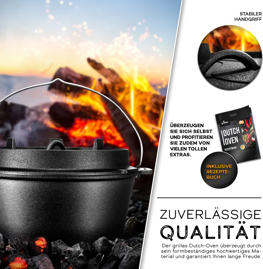Schreibe die erste Rezension für „Grillas® Dutch Oven Set 7,3 Liter / Topf Ohne Füße Deckelheber BBQ Gusseisen Feuertopf Gusstopf Schmortopf“ Antwort abbrechen