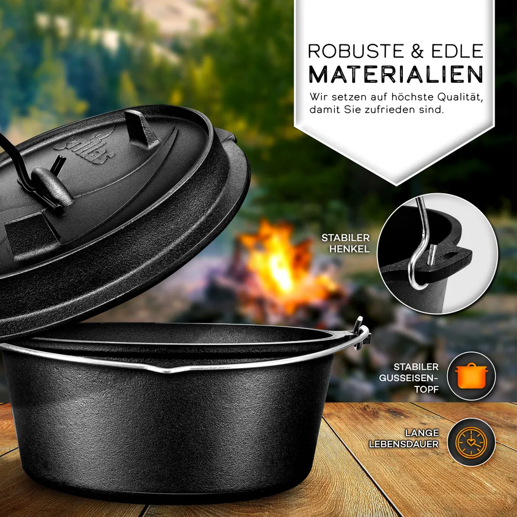 Grillas® Dutch Oven Set 7,3 Liter / Topf Ohne Füße Deckelheber BBQ Gusseisen Feuertopf Gusstopf Schmortopf
